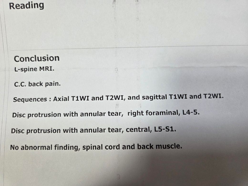 허리디스크는 4,5번이 오른쪽 방향으로 튀어나와 있고, 5,1번 디스크는 중앙방향으로 튀어나온 소견이고 근육에는 이상소견이 없습니다.