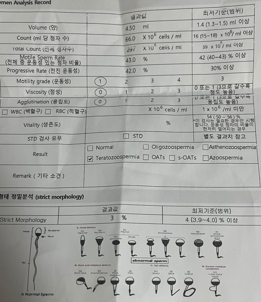 남편 정자 검사 결과,, 자연임신 가능할까요?