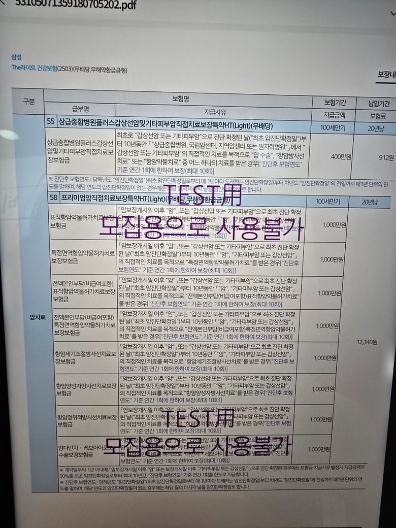 S생명의 더라이트건강보험 상품이네요. 현재 S사에서 주력으로 판매되고 있는 상품이며, 암진단 외에 다양한 암치료비 특약들로 신의료기술들을 커버하는 상품입니다.