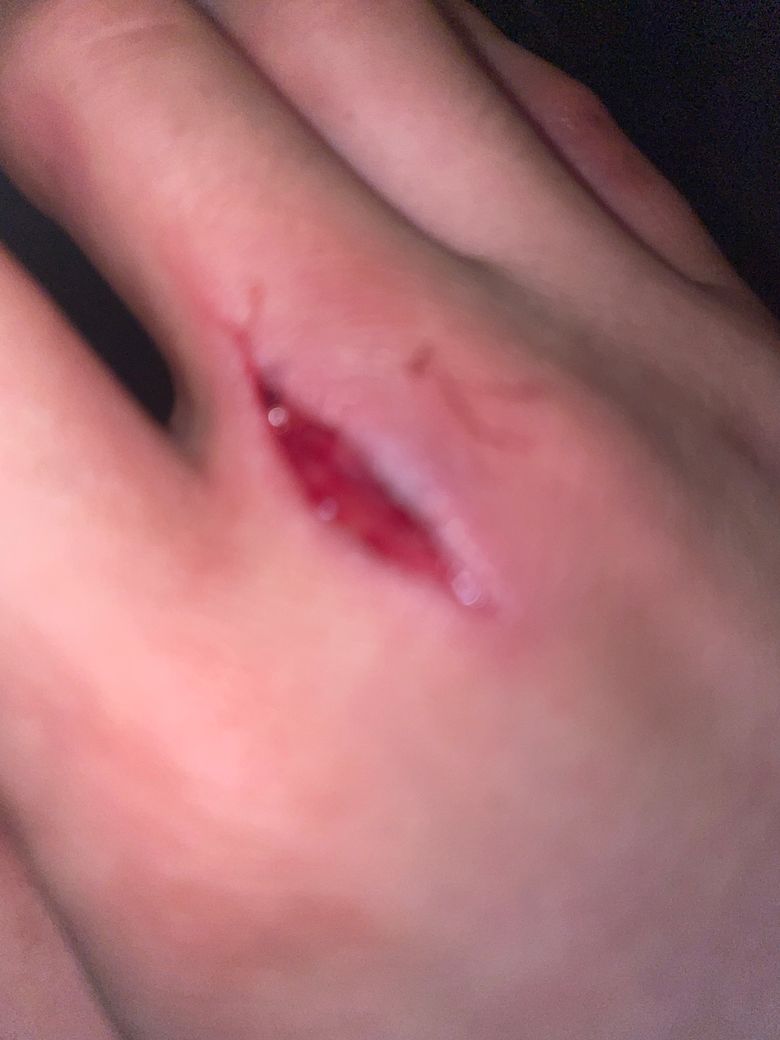 열상을 입으셨습니다. 상처가 아주 깊지는 않지만 많이 벌어져 있기 때문에 봉합을 시행하여야 하는 상황입니다. 그렇기 때문에 지혈 및 소독을 하는 응급처치를 받고 나면 피부를 봉합하여야 하므로 병원에 방문하시어 처치를 받으시는 것이 바람직합니다. 24시간 이내에는 반드시 봉합을 받으셔야 합니다.