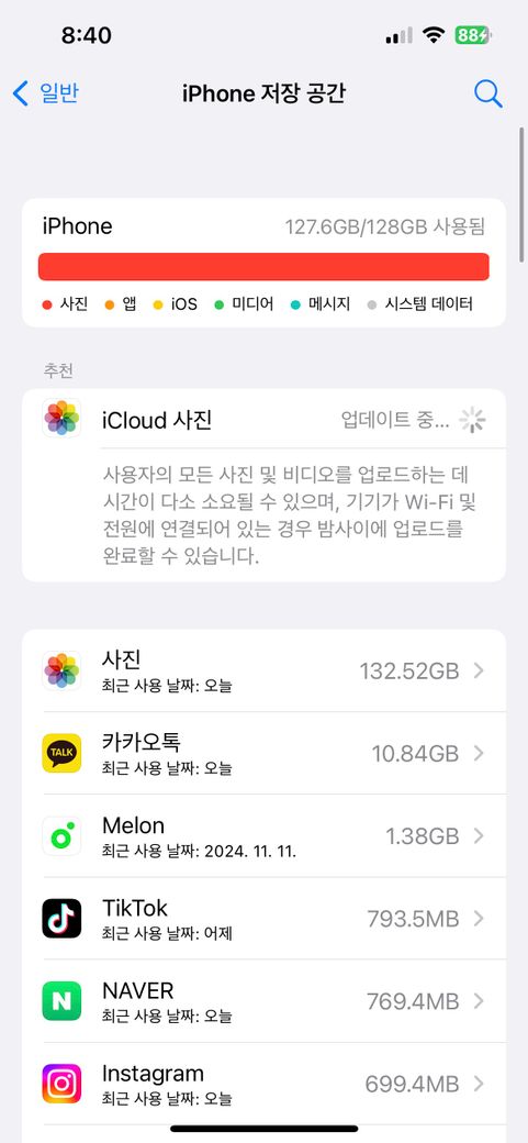아이클라우드 200기가를 사서 사진 업데이트를 했는데 아이클라우드에는 저장이 안되고 아무런 변화없고 폰 저장공간에서 사진용량이 계속 늘어나고 있어요..... 이거 이상해요ㅠㅠㅠㅠㅠ 원래 폰에 갖고있던 사진 용량이 68기가!!!! 였는데 왜 늘어나죠??? 아이클라우드 동기화를 켰는데 동기화는 또 일시정지 되어있고 지금도 폰에 사진용량이 혼자서 끝도없이 올라가고있어요.........
