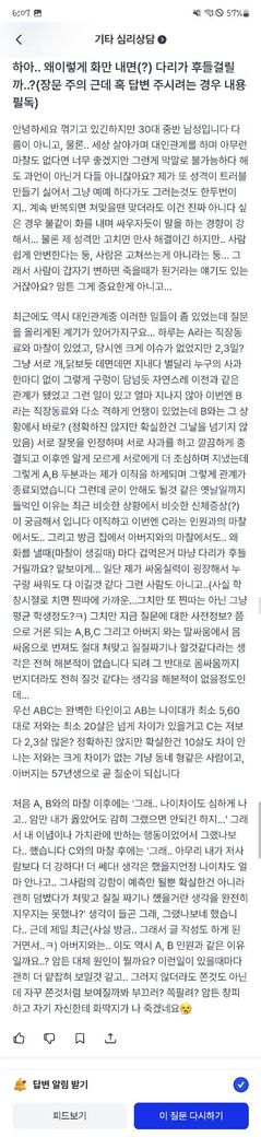 답을 못구해서 그냥 두려움이었나보다~ 하고 넘겼는데 금일 또 동일증상을.. 아니 더 심한 증상을 겪게 되어 분명 몸에 이상이 있는거구나 싶어 재 문의드립니다!! 말씀드린 증상이란 첨부드린 사진 보시면 아시겠지만 뭔가 악을 쓰고 성을 내면 다리가 후들거린다는 것이었습니다 금일은 다리 후들거림은 아주 미약했지만 서두에 더 심한증상이라 표현을 한게 상황 종료 후 명치부근이 쑤시듯 아파오는 통증이 있었다는 겁니다.. 분명 그런 상황 있기 전까지만해도 전혀 기미도 없었는데 상황 발생 직후부터 지금까지도 명치부근 갈비뼈 사이가 미친듯이 쑤셔오는 느낌의 통증이 있는겁니다.. 한숨 자고 일어나서도 증상이 지속되면 병원을 가서 진료를 받아볼 심산인데 만약 원인이 있다면 무엇이며 병원은 무슨과를 찾아가야할까요?