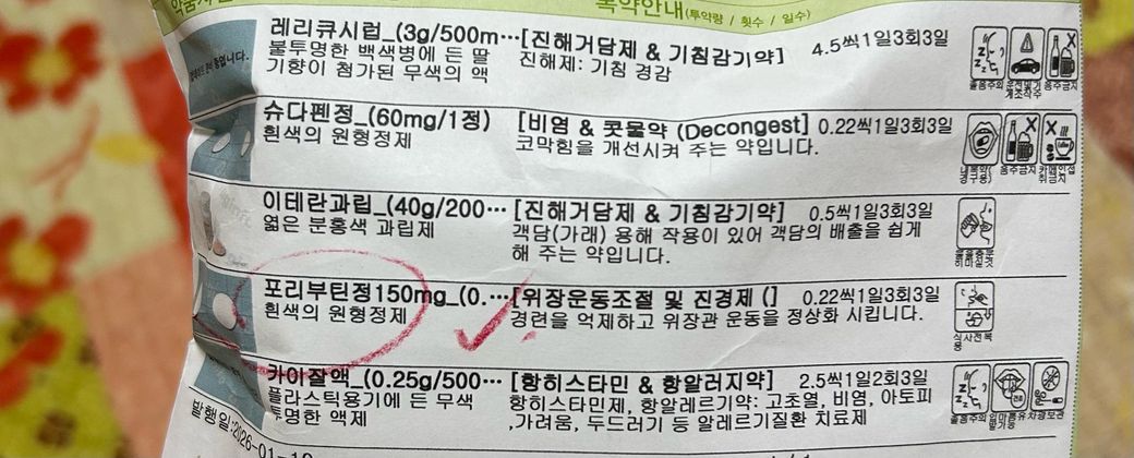 지금 올려주신 성분의 약들은 끝까지 복용해야 하는 성분은 아닙니다. 증상에 따라서 조절을 하실 수 있어서요. 괜찮아지면 중단하셔도 됩니다. 포리부틴의 경우 위장 장애 예방약으로 주신 것 같습니다.