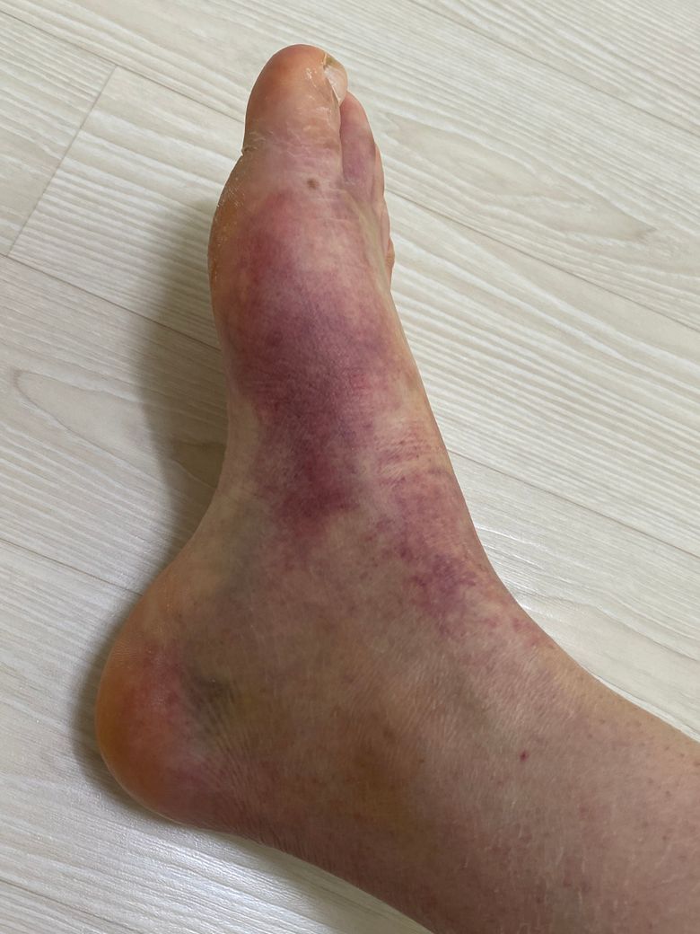 발등 골절과 인대 파열로 통깁스 했다가 풀었는데 인대문제로 이렇게 피멍처럼 든걸까요?