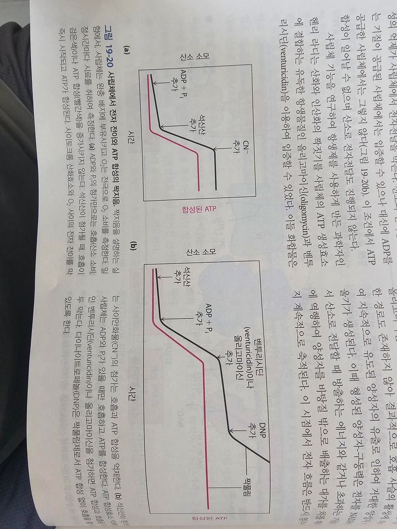사진 속 그림19-20에 쓰여있는 설명처럼 ADP와 Pi의 첨가만으로는 호흡(산소소비)가 증가하지 않는다고 이해하셔도 무방합니다. ADP와 Pi가 미토콘드리아 내에 있다고 해서 전자전달계가 즉시 활성화되는 것은 아니며 전자전달계는 NADH와 FADH2와 같은 전자공여체가 제공되어야 활성화됩니다. 전자공여체가 없으면 전자전달계의 활성은 제한적이며, 산소 소비도 증가하지 않습니다.