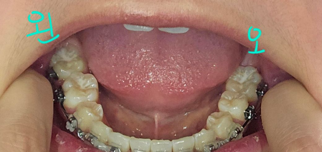 왼쪽 위아래는 둘다 작은 어금니, 오른쪽 위는 작은 어금니를 발치했는데 아래는 큰 어금니가 많이 썩어있어서 발치를 하고 교정 진행했어요