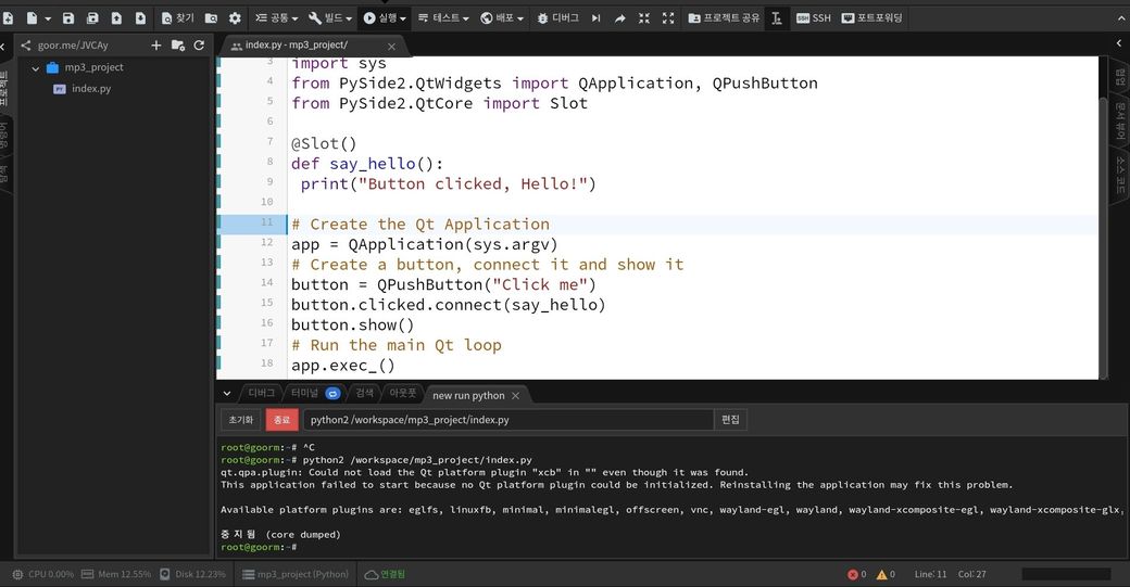 구름IDE 가상환경에서 파이썬으로 pyside2 gui 관련코드 실행 에러가 나네요.