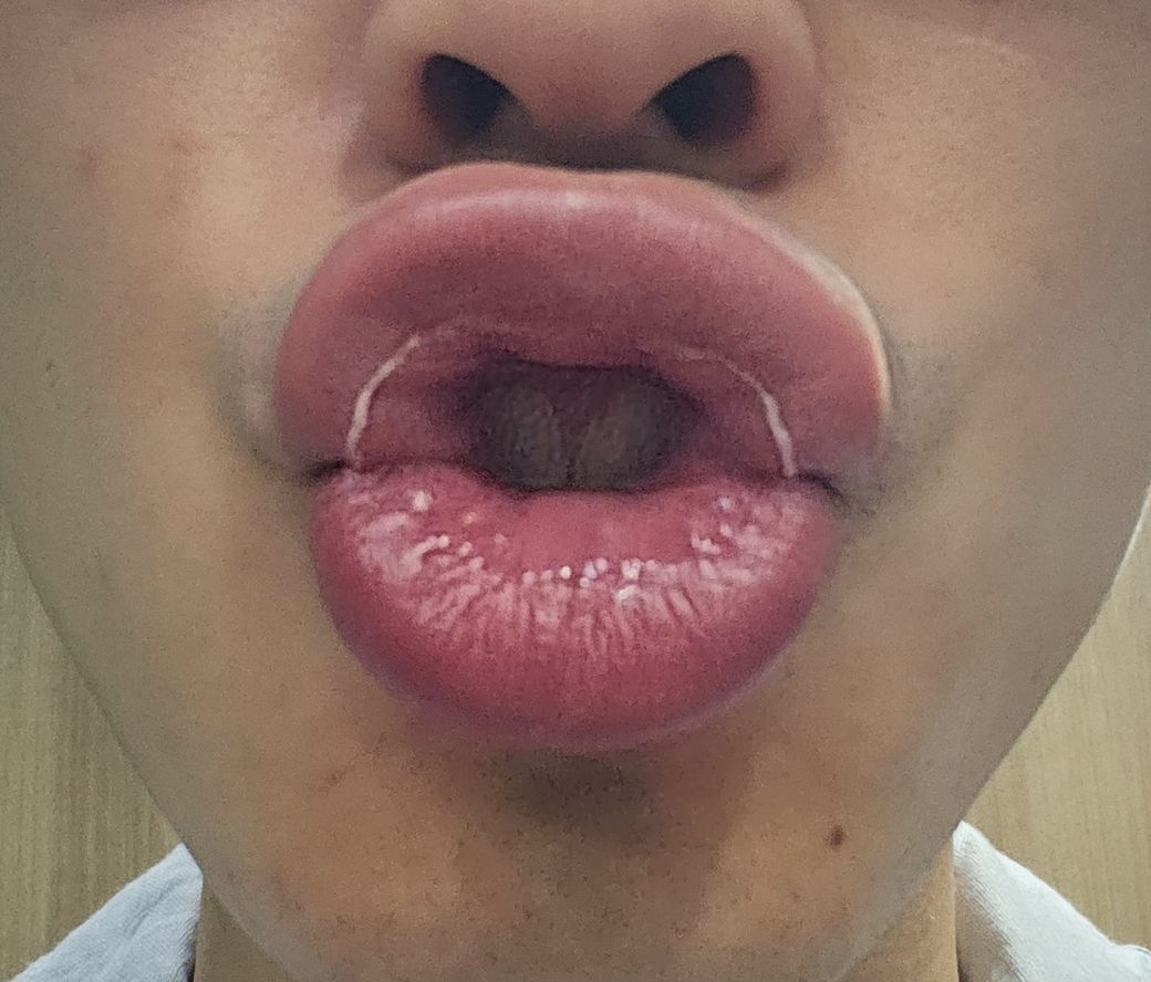 특별히 통증이 있거나 하진 않고, 윗입술 아랫입술 모두 생깁니다. 입을 가만히 다물고 있으면 보이지 않습니다. (입술의 외부 노출되는 부분과 내부의 딱 경계선? 같은 지점이라)