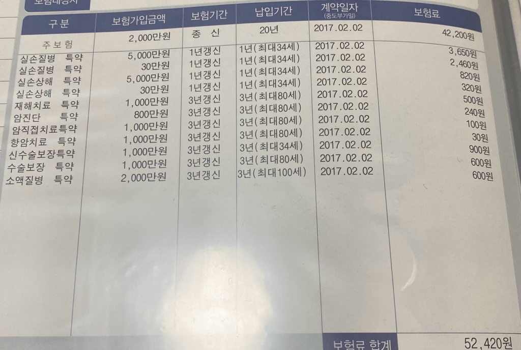 - 주계약 보험료 42200원, 보장금액 2000만원 (ci 80%, 소액암 제외한 일반암 진단시 약 1600만원 보장 효과)