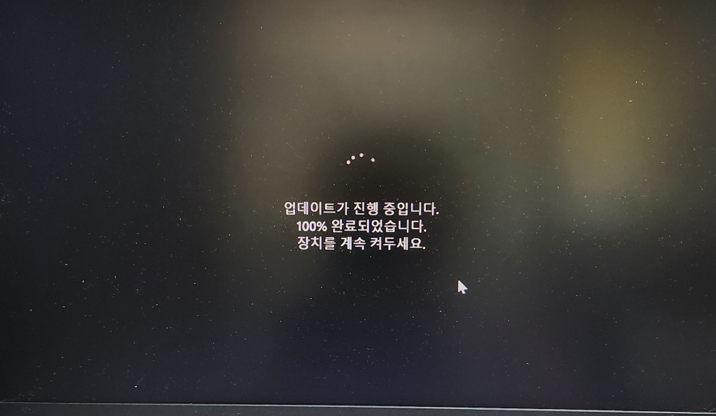 오랫만에 노트북을 켜니 방전되서 충전하는데 업데이트가 떠서 바로 업데이트 시작눌러서 30분만에 업데이트완료되고 100%완료 뜬지 40분째 이러고 있습니다.
