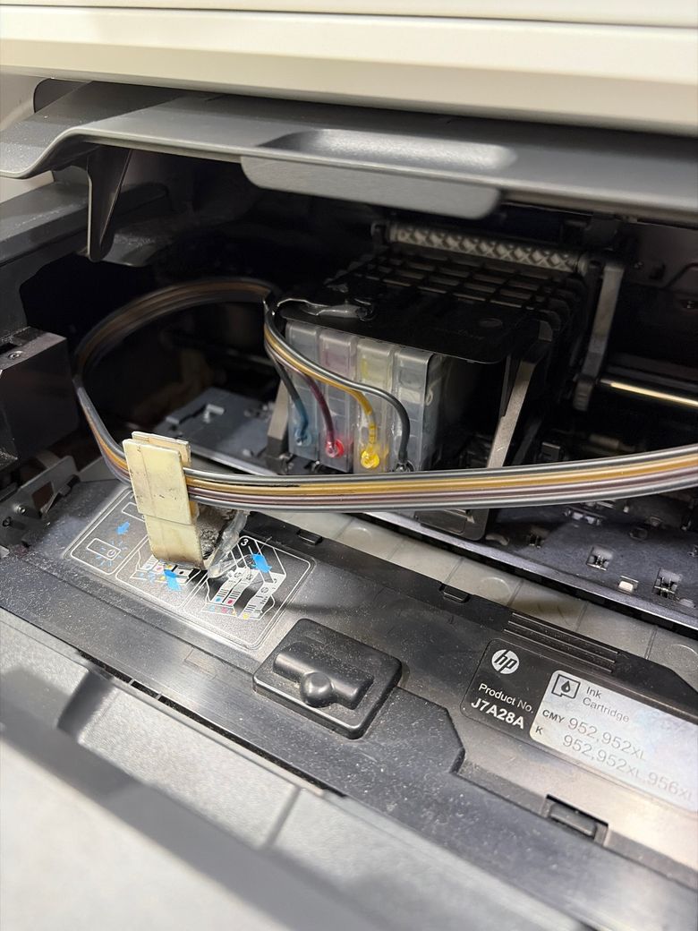 안녕하세요. 무한잉크 프린트의 경우 보통은 잉크통을 외부에 장착하는 경우가 많은데, 내부에 장착되어 있는 형태 같습니다. 그래서 잉크 공급 노즐의 간섭이 있어서 종이 걸림 등이 있으신 것 같습니다. 저 하얀색 클립 같은게 원래는 잉크통 위 쪽이나 기기 내부 상단 등에 고정 되도록 해서 종이 걸림 등의 문제가 발생하지 않도록 한 것 같은데 떨어진 것 같네요. 양면테이프나, 글루건 등을 이용해서 간섭이 없을 것 같은 부분에 부착해 두면 될 것 같습니다.