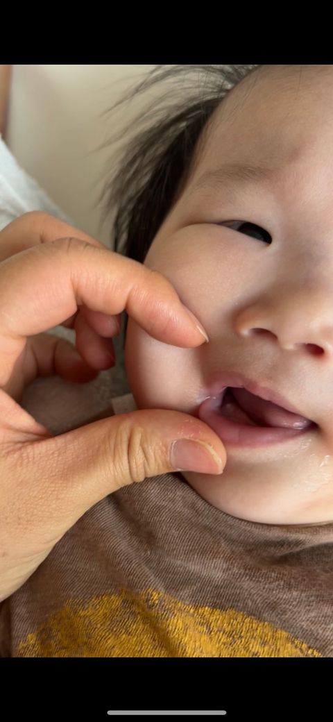 151일 된 여아입니다 사진 첨부한 것과 같이 8번 유치가 먼저 나왔는데 괜찮은건가요? 다른 이는 안보이고 오른쪽 어금니만 보이네요