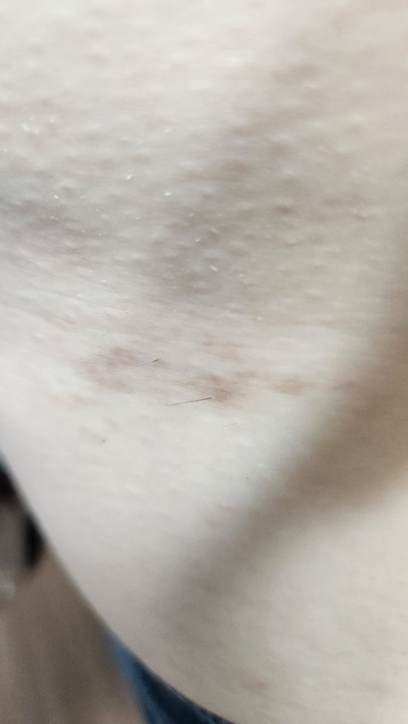 사진에는 대상포진의 전형적인 소견이라고 할 수 있는 군집된 수포성 피부 병변이 관찰되지 않습니다. 사진을 보고 대상포진을 강력하게 의심할 수 없습니다.