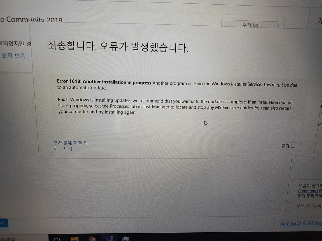 로그 파일에 “Error 1618. Another installation is already in progress (오류 1618. 다른 설치가 이미 진행 중입니다 ” 라는 문구가 있습니다.