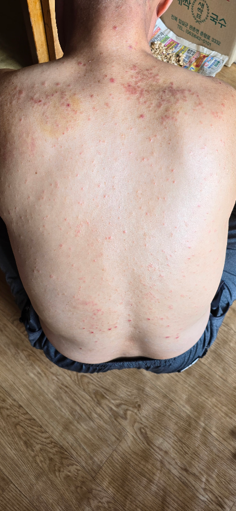 얼굴을 제외한 전신에 위 사진과 같은 피부염이 생기고 있습니다. 밤에 특히 가려워하셔서 응급실 가서 주사도 맞고, 여러 피부과, 병원을 다니시며 약과 연고를 처방받아 복용하고 있지만 증상 개선이 안 되고 있어 고민입니다.
