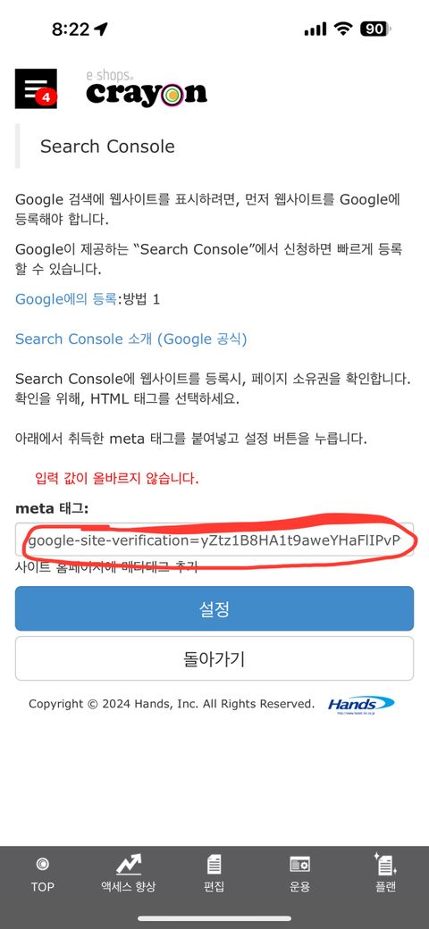 크레용 홈페이지 제작 툴에서 페이지 설정 > SEO 설정 또는 HTML 헤더 옵션을 찾아 붙여넣기.