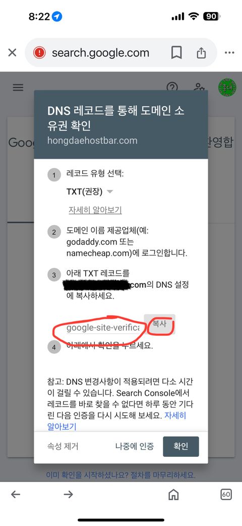 2. DNS 설정 확인 및 적용 방법구글이 제공한 빨간 글씨(예: google-site-verification=xxxxxx)를 DNS 설정에 추가하려면, 아래 단계를 참고하세요.