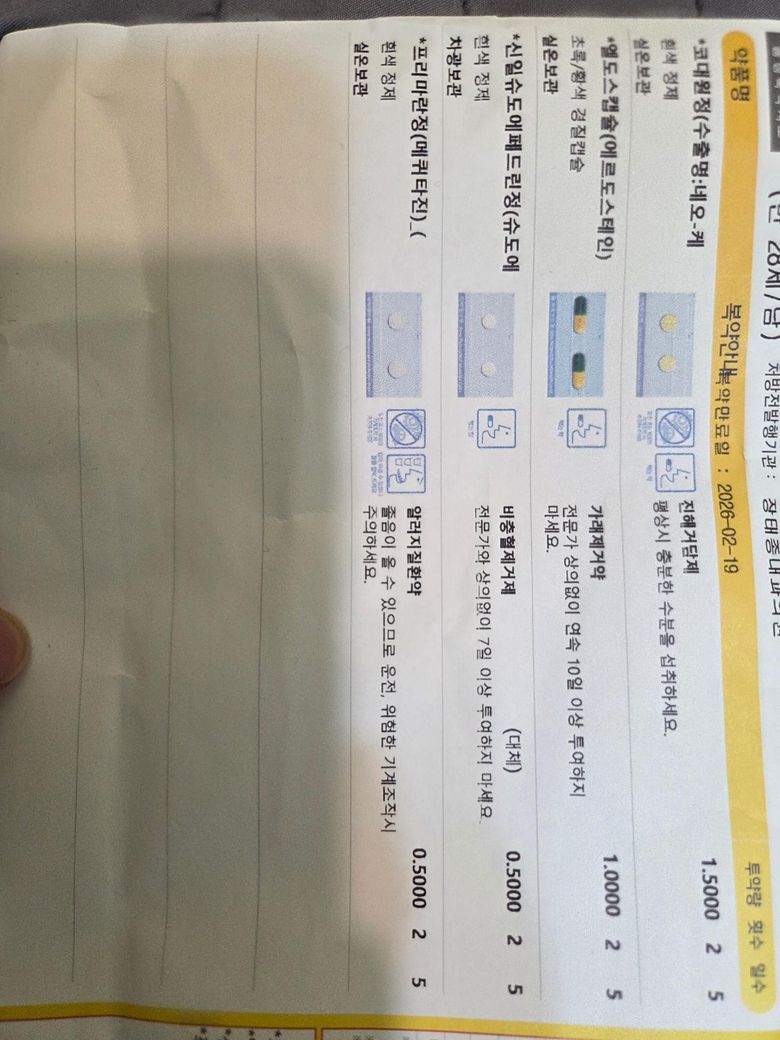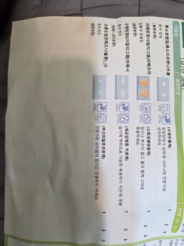 감기약을 처방받아 먹는중 피부과 시술 후 약 처방을 받았고 약국에서 물어볼 당시엔 감기약 성분을 몰라서 제대로 답변을 못받고 피부과 처방약 다먹고 감기약 먹으라고 하셨거든요 감기가 거의 다 낫긴했는데 같이 먹으면 안좋긴 한건가요?? 노란줄이 감기약이고 녹색줄 있는게 피부과약 입니다