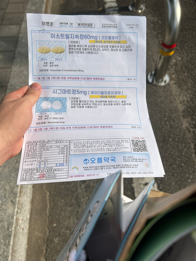 그래서 사진에 있는 약을 처방받았는데 저번주에 저 약봉투에 써있는 약을 복용했는데 증상이 괜찮아졌다가 저거 다 복용하고 어제 저 설명서에 쓰여져 있는 약물을 처방받아서 복용중인데 숨쉬기 힘든게 여전히 그대로 있습니다 오히려 복용했을때 더 가슴이 두근거립니다 안정제 하나 빠졌다고 약을 먹어도 증상이 지속되네요.. 제가 보았을땐 변형 협심증보단 과호흡증후군 같은데 의사선생님께서는 어떤게 가능성이 더 높아보이시나요? 흉통은 자주는 아니고 가끔있습니다 (찌릿함,두근거림) 공황장애나 과호흡 증후군 증상에 찌릿함과 두근거림 같은 흉통이 있을수 있나요?