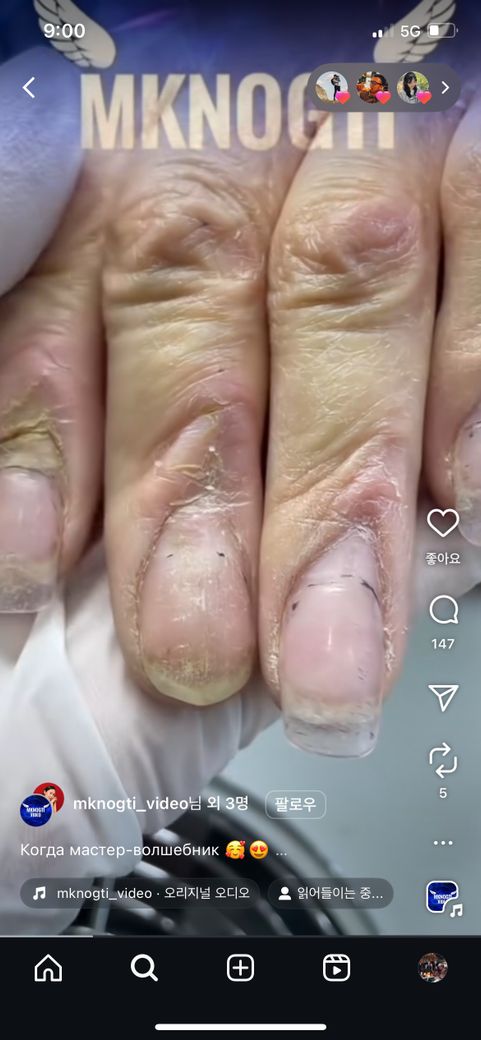 손톱 아래 살이 후퇴된 모습과 함께 황변, 두꺼워진 표면, 거칠고 각질화된 피부가 보입니다. 이는 손톱박리증, 손발톱 건선, 진균 감염(무좀), 또는 만성 자극에 의한 변화일 수 있습니다. 특히 인조손톱, 네일아트 등의 자극이 반복되었거나 보습이 부족했을 경우 이런 형태로 손상이 진행되기 쉬워요