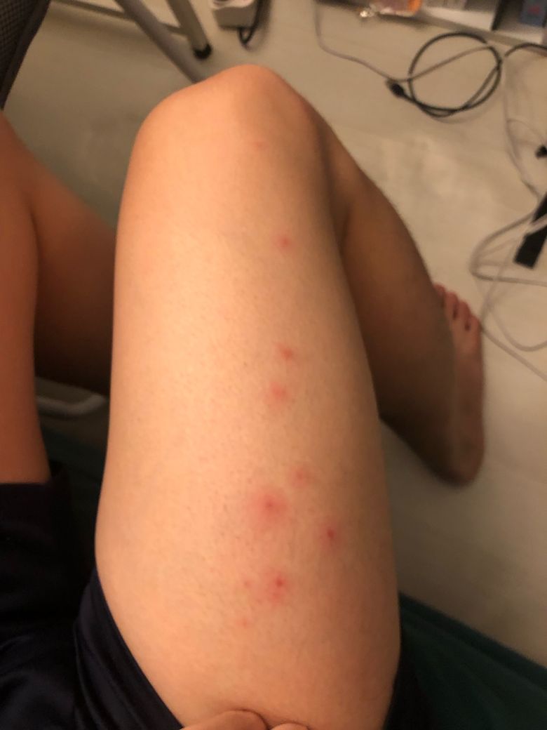 - 가슴팍, 허벅지, 배, 정강이 등 온 몸 여러 군데에 났음. 가렵지는 않음.