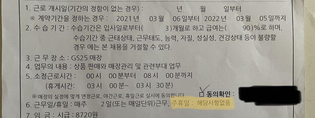 근데, 사진과 같이 근로계약서에 [주휴일: 해당사항없음] 이라고 적혀있습니다.