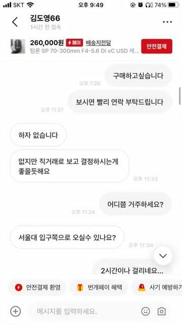 판매자와 직거래로 만나서 거래를 진행했습니다 당시 오후 1시경이였고 저는 렌즈로 테스트 촬영을 몇번 해보고 사진이 약간 번지는 현상을 확인했고 그당시 빛이 강함을 고려하면 그냥 할레이션인줄 알고 거래를 진행했습니다 하지만 집으로 가던중 다른 몇번의 사진을 촬영해보고 저는 문제가 있다는걸 파악했고 집으로 도착후 여러 테스트를 해본 결과 문제가 있다라고 결론지었습니다