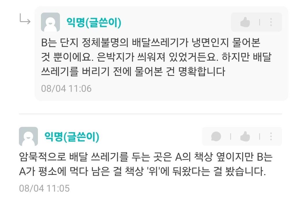B가 외출 전에 배달 쓰레기를 들고 가져다 버리는 일반적이고 예상 가능한 행위 중이었고 A는 게임중이라 몰랐답니다