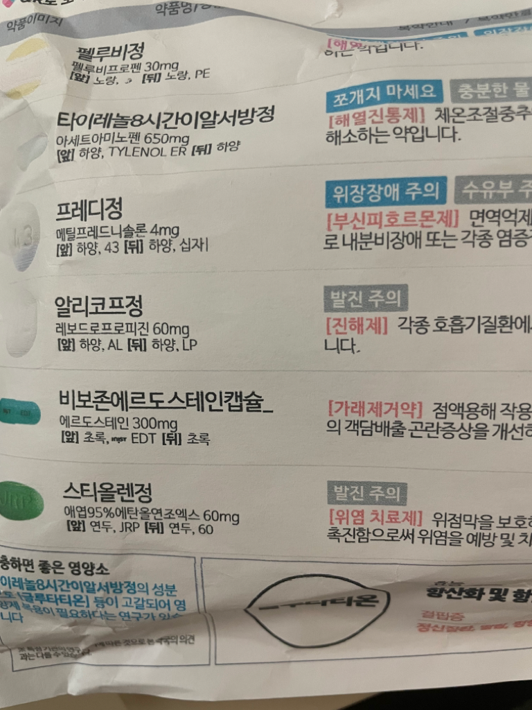 펠루비정/타이레놀8시간이알서방정/프레디정/알리코프정/비보존에르도스테인캡슐/스티올렌정 약들의 경우 이소티논과 서로 성분이 중복되거나 상호작용이 있지 않기에 함께 복용해도 가능합니다.