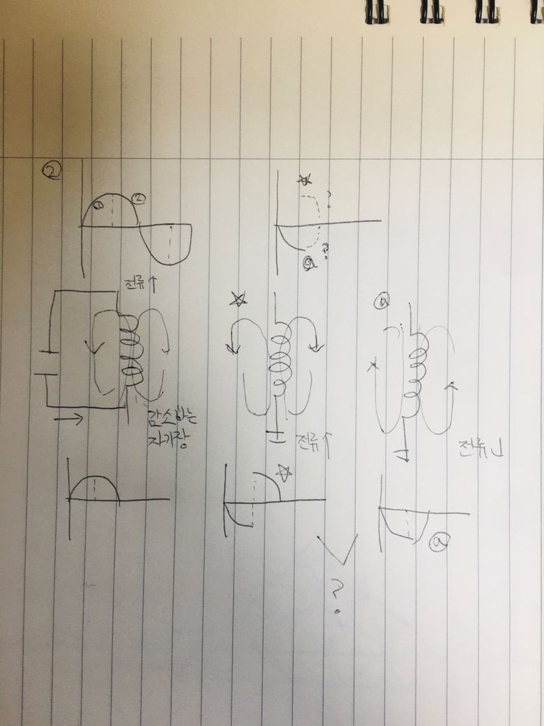 제 생각에는 페러데의 법칙의 실험처럼 원래 받던 힘을 유지하는 방향으로 (진동회로의 전류가 위의 방향으로 가장 세게 흐르다 점점 약해지는데 이 힘을 유지하는 방향으로) 즉, 안테나 회로의 아래로 점점 강하게 흐르던 전류가 위쪽으로(별 모양의 그래프)로 방향을 바꾸어 강하게 흘렀다가 점점 약해지는 식으로 흘러야하지 않나요? 뭔가 개념이 헷갈려 질문드립니다.
