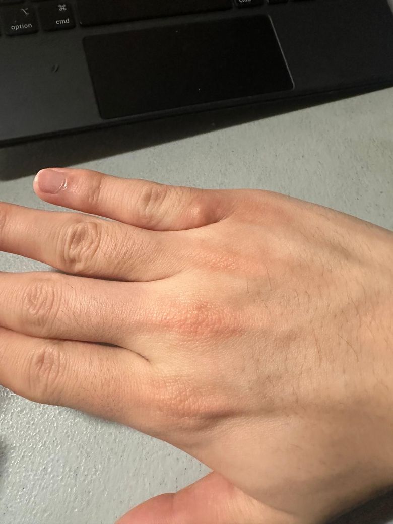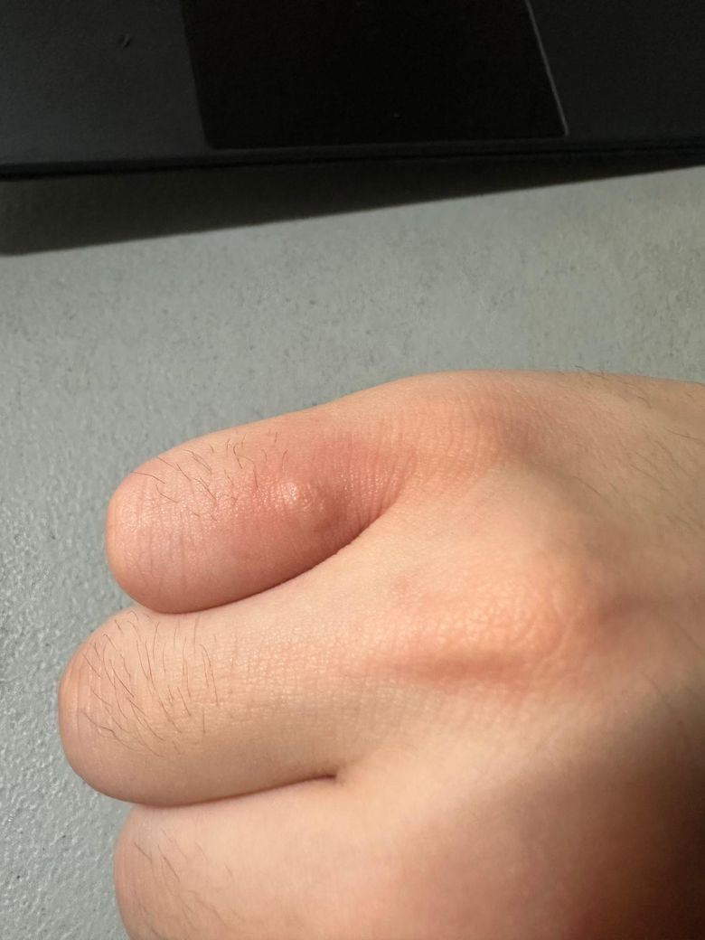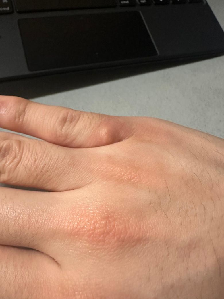 사진상 손등 관절 부위에 국소적인 팽진 형태의 부종과 약한 홍반이 보이며, 중심부가 약간 도톰하게 올라온 형태입니다. 전반적으로는 급성 두드러기보다는 벌레 물림(곤충 교상)이나 접촉성 피부염 양상이 더 가까워 보입니다. 가려움이 심하지 않고 국소적으로 제한된 점도 이에 부합합니다.