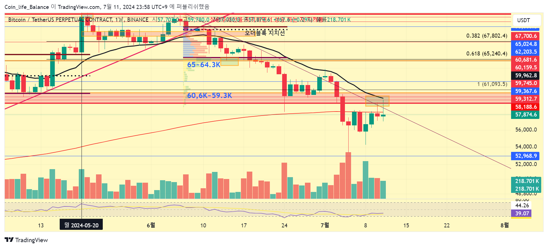 그리고 단기적으로는 59K부근에서 강한 저항을 가지고 있어 이를 상향 돌파하려면 큰 거래량이 동반된 상승의 힘이 필요 할 것으로 보입니다.