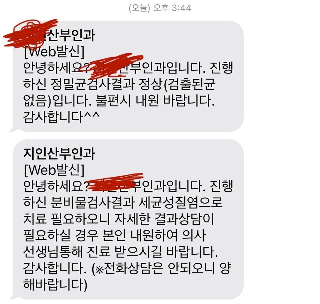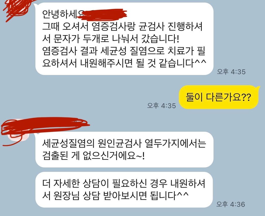 예전에 두 번 간 것 중에서 저렇게 정밀균 검사 정상, 세균성 질염 맞다고 문자 받았을때 정작 가니까 원인균은 모두 정상이라고 나왔던 것 같고 별다른 조치가 없었는데 내원하는게 맞는지 궁금해요