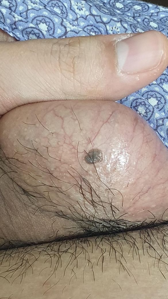 우선 헤르페스 감염에서 보이는 수포성 병변이나 곤지름 감염에서 관찰되는 사마귀 양상의 병변이 아니므로 성병 가능성은 사실상 낮습니다. 경계가 비교적 명확하고 색조의 혼재나 표면의 결절성 변화가 없어 흑색종과 같은 악성 질환으로 보이지는 안흐며 단순 모반으로 판단됩니다. 좀 더 경과를 지켜보시고 모양이나 크기의 변화가 나타난다면 피부과나 비뇨의학과 진료를 보시는 것을 권해드립니다.