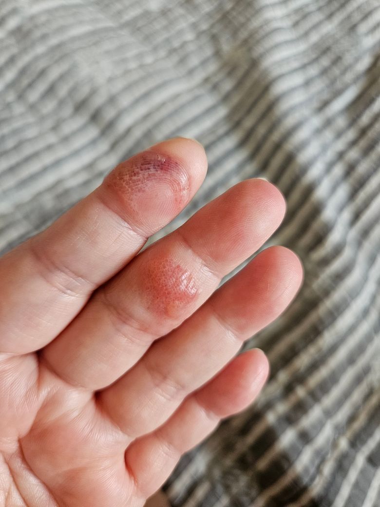 네.손가락 피부염이 심하게 생기셨네요 피부과가셔서 치료연고를 바르시는것이 좋습니다.