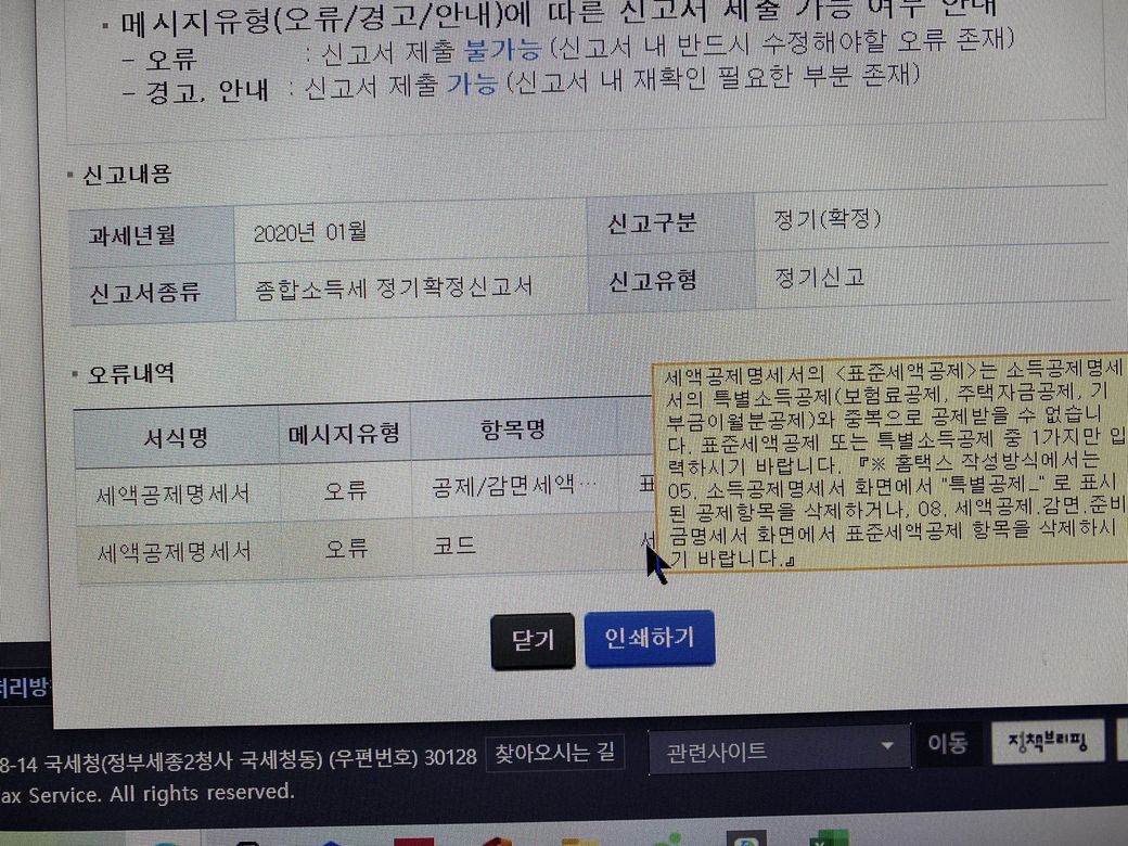 근데 제가 다 작성하고 제출을 하려고 하니 오류가 있다고 하더라구요 이렇게요! 표준세액공제를 적용하려면 특별소득공제를 0으로 입력하라고 해서 소득공제 명세서에서 특별공제_보험료를 0으로 입력했는데 이렇게 하는거 맞나요? ㅠㅠ 어렵네요 ...