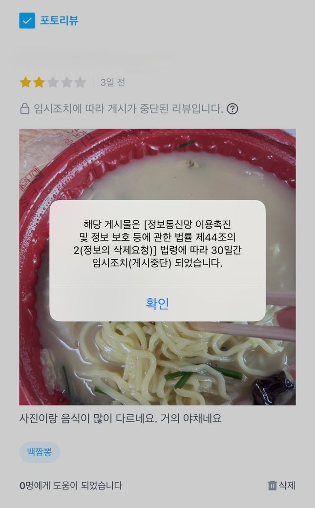 그런데 며칠 뒤, 쿠팡이츠로부터 '점주의 요청으로 해당 게시물이 정보통신망법 제44조의2에 따라 30일간 임시조치(블라인드 처리)되었다'는 통보를 받았습니다. (첨부 사진 참조)