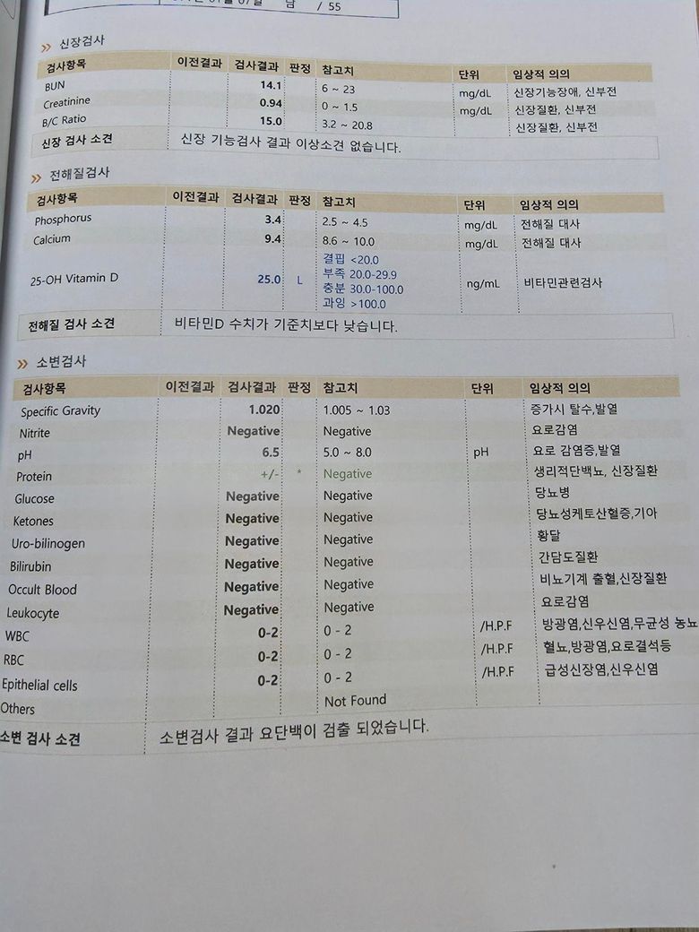 넵 드셔도 됩니다. 검사지를 보면 신장기능(BUN 14.1, 크레아티닌 0.94)은 정상 범위입니다. 다만 소변에서 단백이 ±로 검출되어 “미량 단백뇨”가 있는 상태입니다. 이런 경우는 일시적(운동, 탈수, 검사 직전 활동)일 수도 있어 단 한 번 결과만으로 신장질환으로 판단하지는 않습니다.