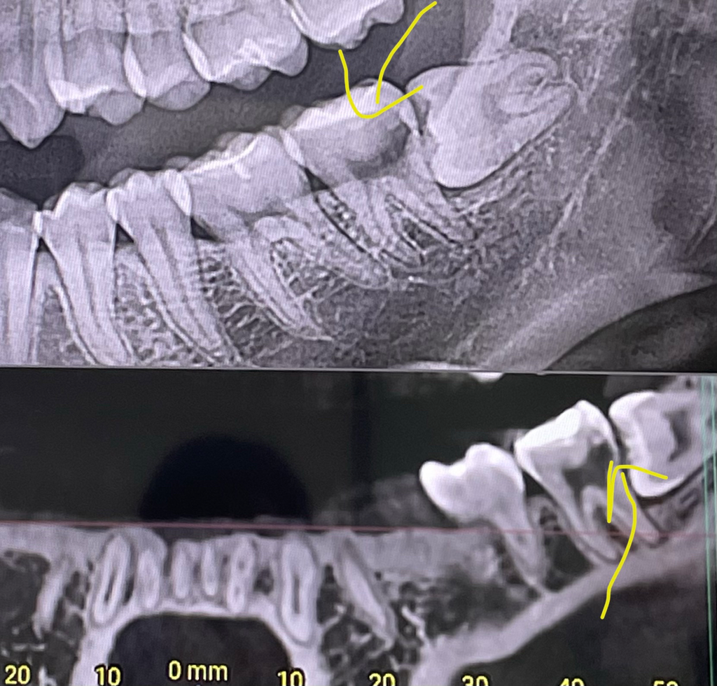 사랑니 때문에 안좋은 부위에 충치가 생기신거 같습니다. 부위도 안좋고 충치도 신경에 가까워 보이네요. 신경치료를 하셔야될것같습니다.
