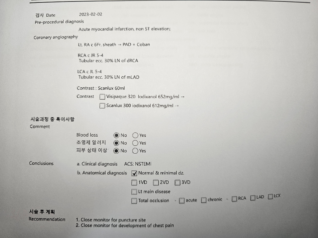 안녕하세요. 이욱현 의사입니다. NSTEMI는 ST 변화가 없는 심근경색을 의미합니다. 검사 결과만으로 진단하지 않고 환자의 증상과 시간에 따른 양상이 중요하기 때문에 진료하신 선생님과 상의하는 것이 좋습니다. 진료 받은 것에 대해서 다른 의견을 듣고 싶은 경우에는 다른 심장내과 진료를 받으시는 것도 방법일 수 있습니다.
