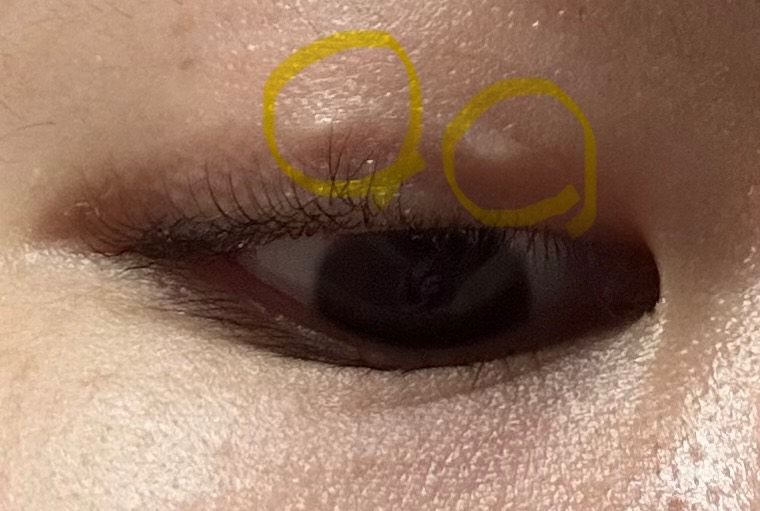눈꺼풀의 피부에 위치한 모낭, 피지샘 등의 과분포가 가장 가능성이 높습니다.