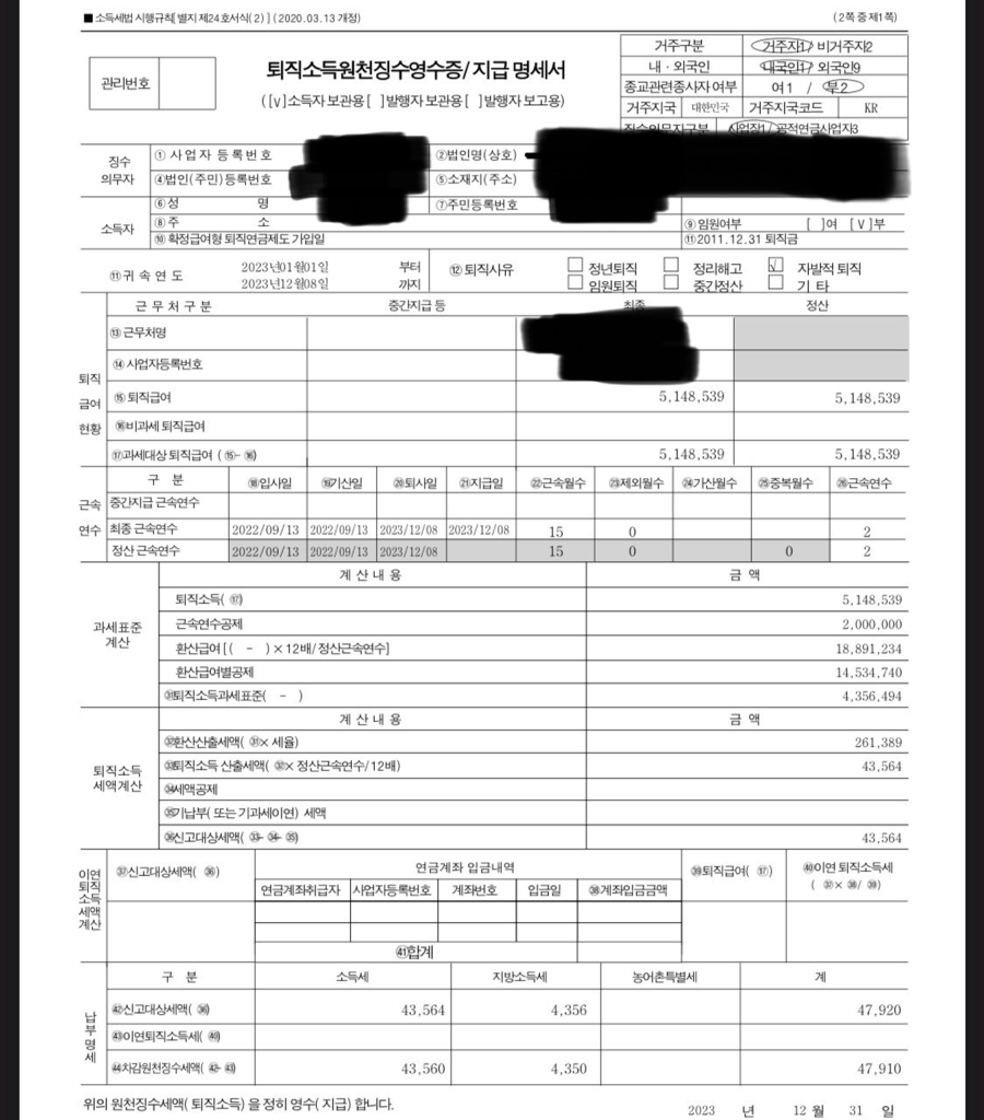 저건 퇴직금 명세서가 아니라 퇴직소득원천징수영수증이고 퇴직금액과 세금만 나옵니다. 알 수 없습니다.