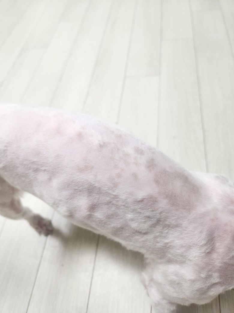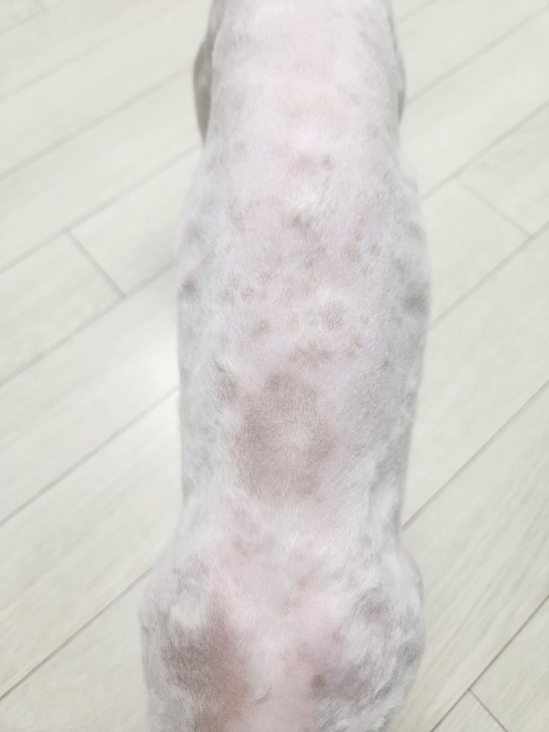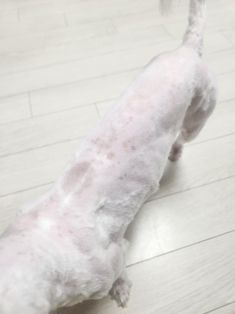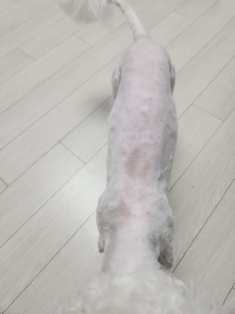 이제 8개월 되어가는 비숑 중성화안한 여자아이인데요 여름이라 털을 밀었는데 등, 발에 갈색?점박이 같은것과 넓게퍼진 자국 같은것과 발, 꼬리에 약간붉은점도 한두개있어요 햇빛에 장시간 노출된적은 최근에는 없는데 혹시 심각한건가요??ㅠㅠ