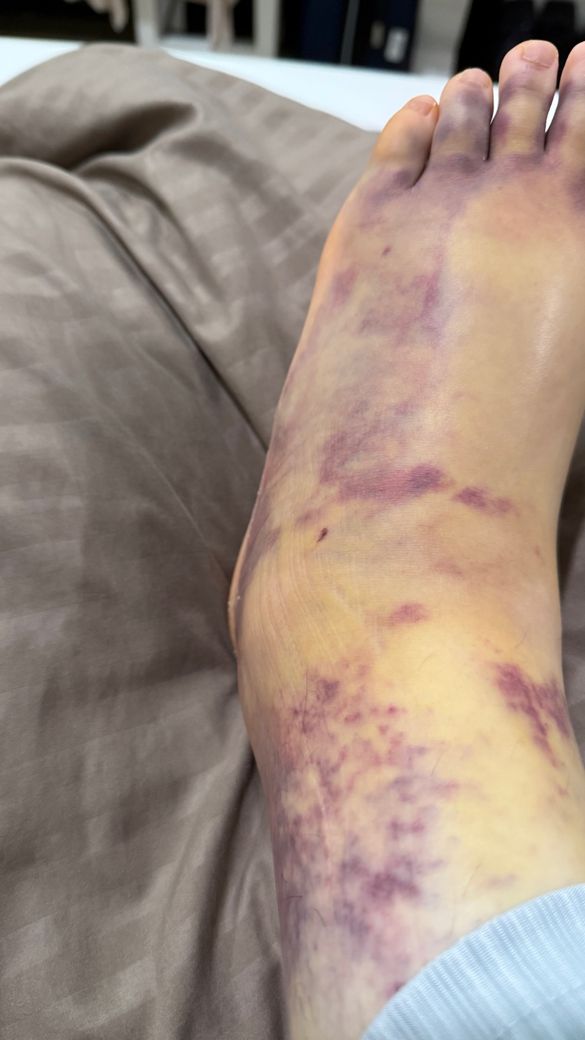 계단에서 넘어져서 발목 인대를 다쳤는데 제가 해외에 있어서 제대로 진료를 못 받고 깁스를 착용중입니다. 5일 지났는데 발목부터 발가락까지 멍이 들었고 아직 붓기가 심합니다. 해외 병원에서는 그냥 발목 인대가 늘어난거라고 하는데 상태가 너무 안좋아서 혹시 인대가 파열된건지 걱정이 됩니다.알 수 있을까요? X-ray 사진 첨부합니다.