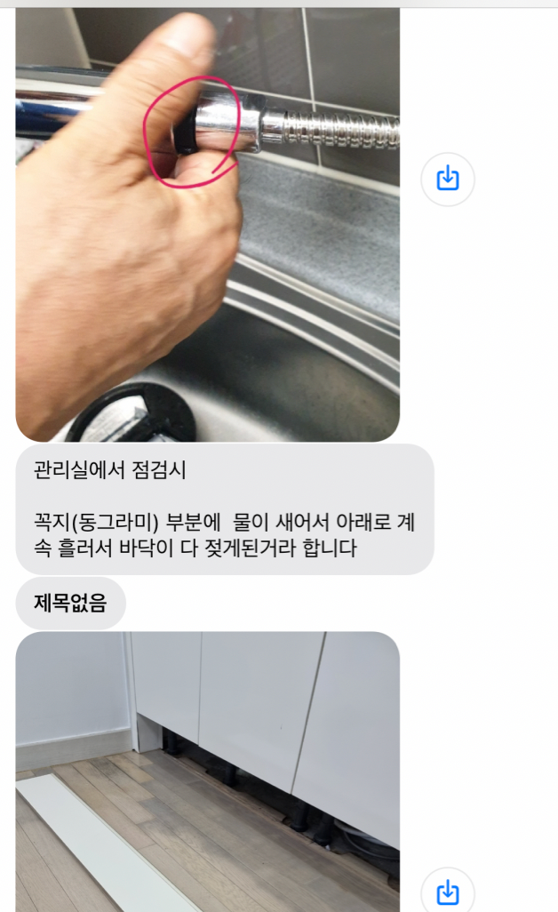 관리실에서 확인해보니 그 싱크대 물나오는 샤워기? 그쪽 사이 부분이 벌어지면서