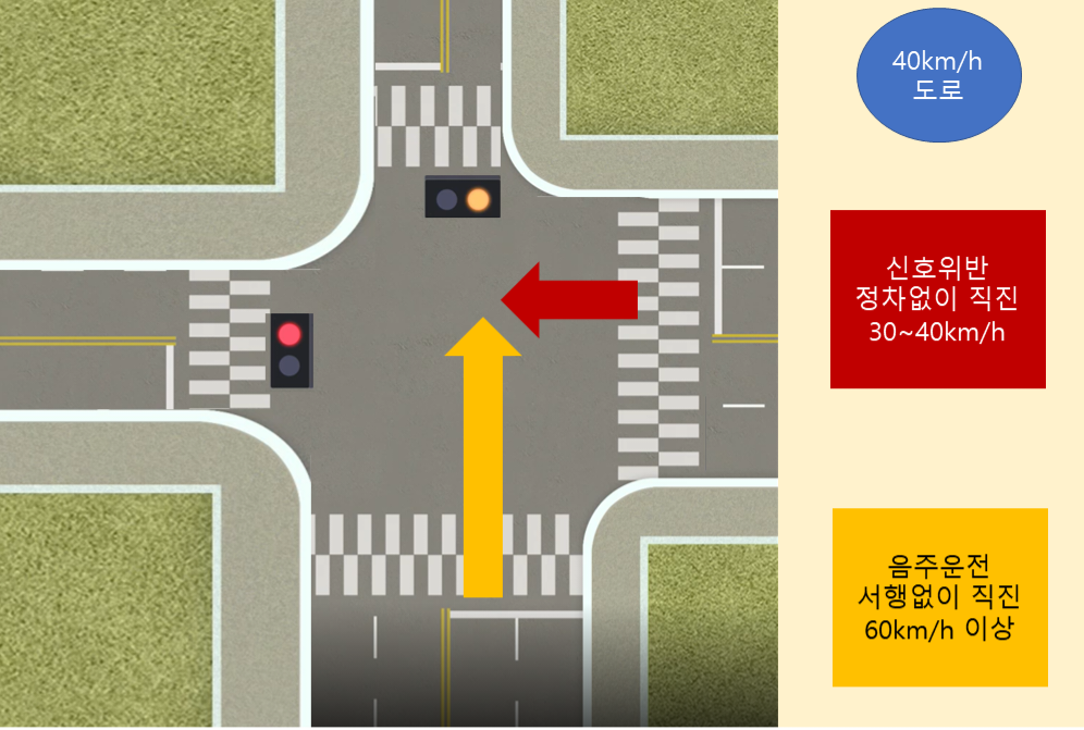 하지만, 황색점멸등 진행 차량이 20km/h 이상 과속(객관적으로 인정될 경우)으로 인정이 되고, 음주상태라면,