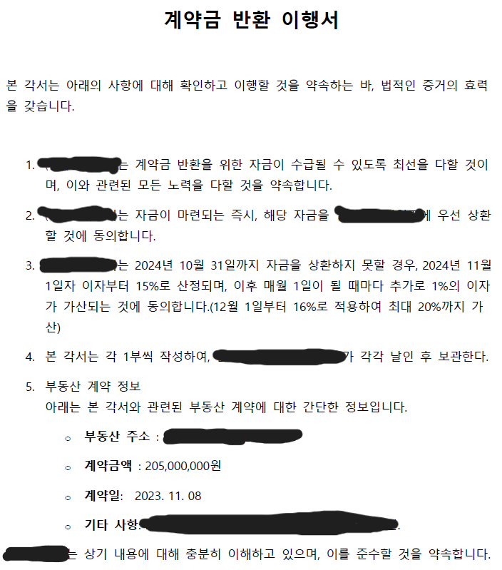 계약금을 반환해야하는 상황이 되었습니다. 하지만 2024년 10월 현재까지 반환하지 않고 있습니다.