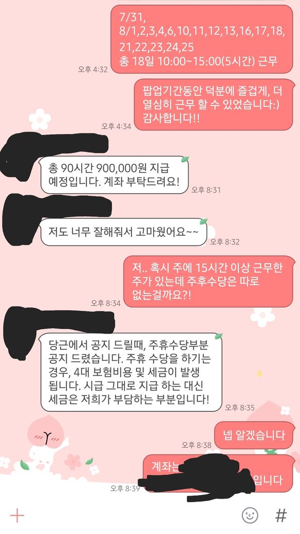 시급 만원, 10:00~15:00까지 휴게없이 실근무 5시간으로 총 90시간 근무했습니다.