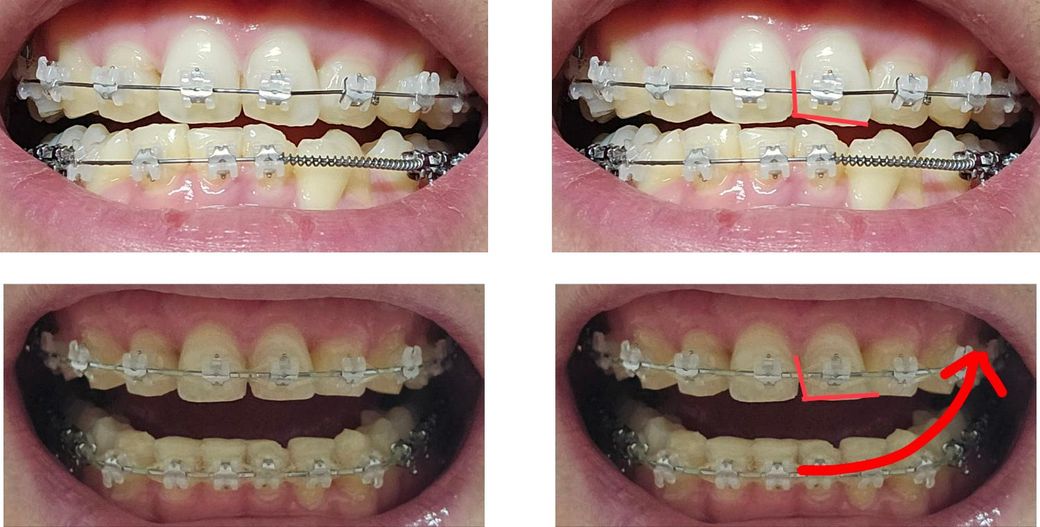 교정 초기의 오른쪽 앞니(21번) 아랫면을 자세히 보시면 오른쪽보다 왼쪽이 더 높게 경사진 것을 보실 수 있습니다. (빨간선 표시 부분)