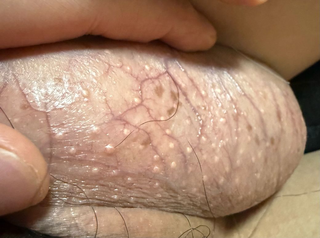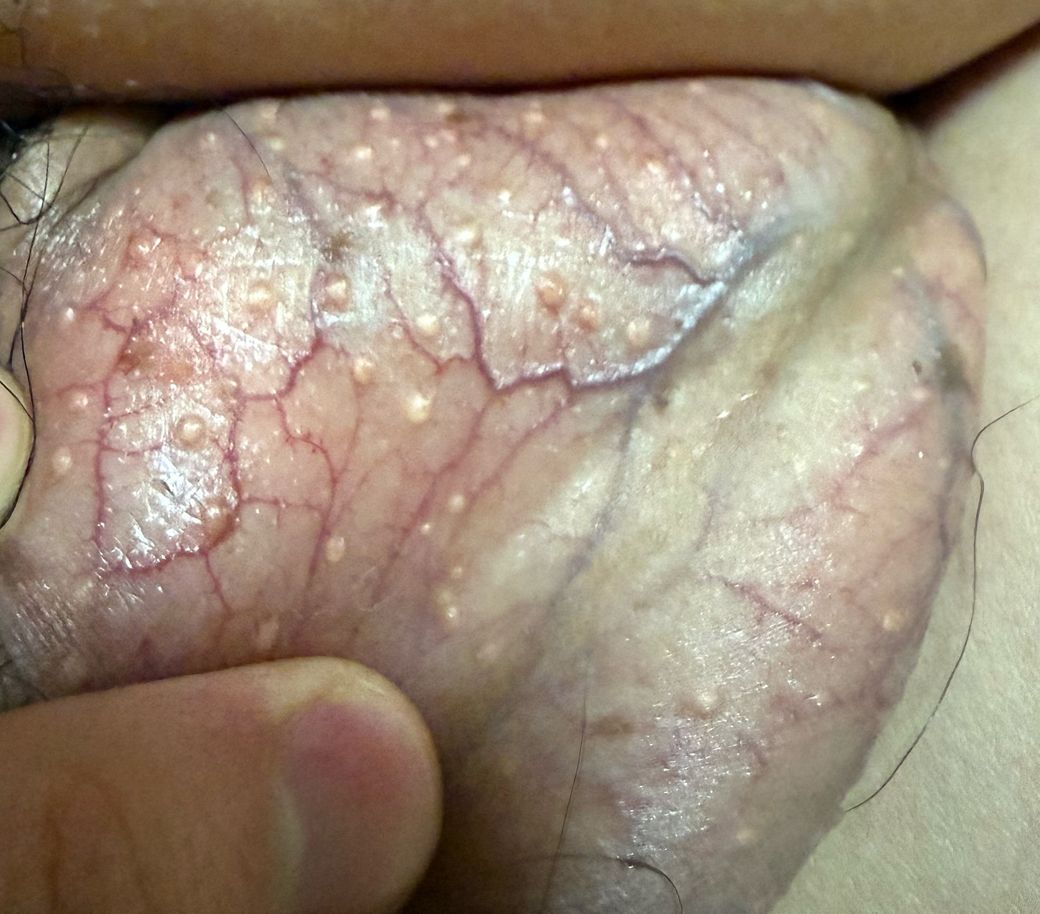 올려주신 사진상 노란색의 다발성 구진이 관찰되고 있고 통증이나 가려움 등이 동반되어 있지 않아 피지선의 과증식으로 인한 병변으로 판단할 수 있습니다. 성병으로 인한 피부 매개 질환은 헤르페스 감염이나 곤지름이 대표적인데 수포성 병변이 아니며 사마귀 양상의 결절성 병변이 아니므로 성병 가능성은 낮습니다. 이러한 병변은 반드시 치료를 필요로 하지는 않지만 제거를 원한다면 레이져 시술 등을 고려해 볼 수 있어 이러한 시술이 가능한 비뇨의학과나 피부과 진료를 보시는 것을 권해드립니다.